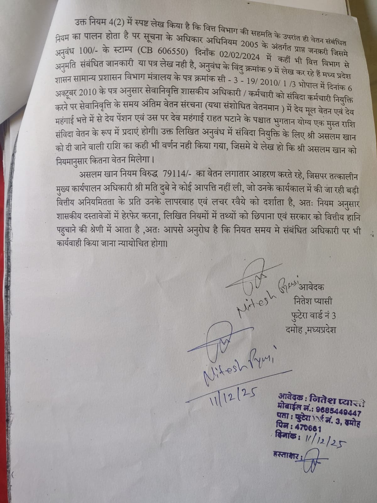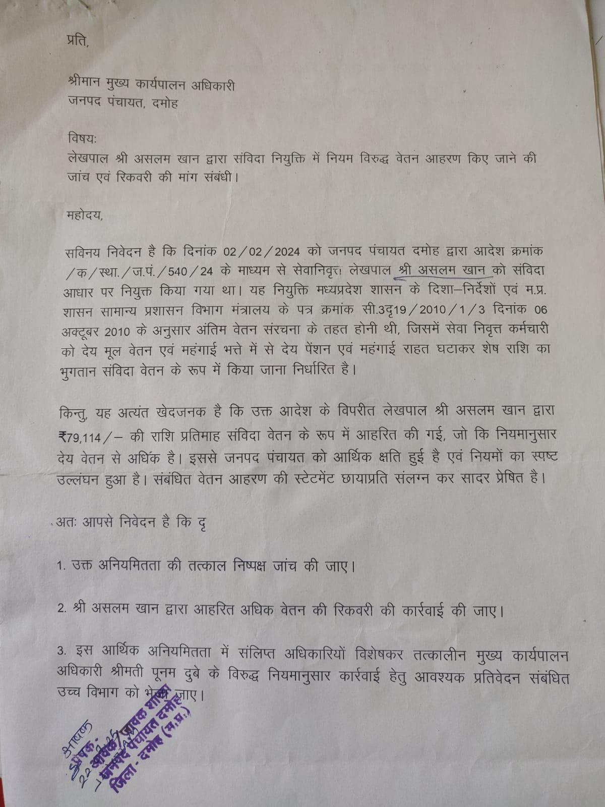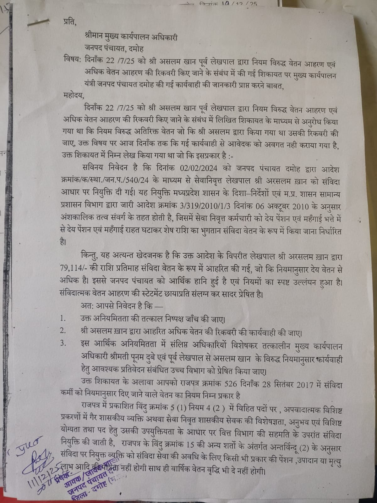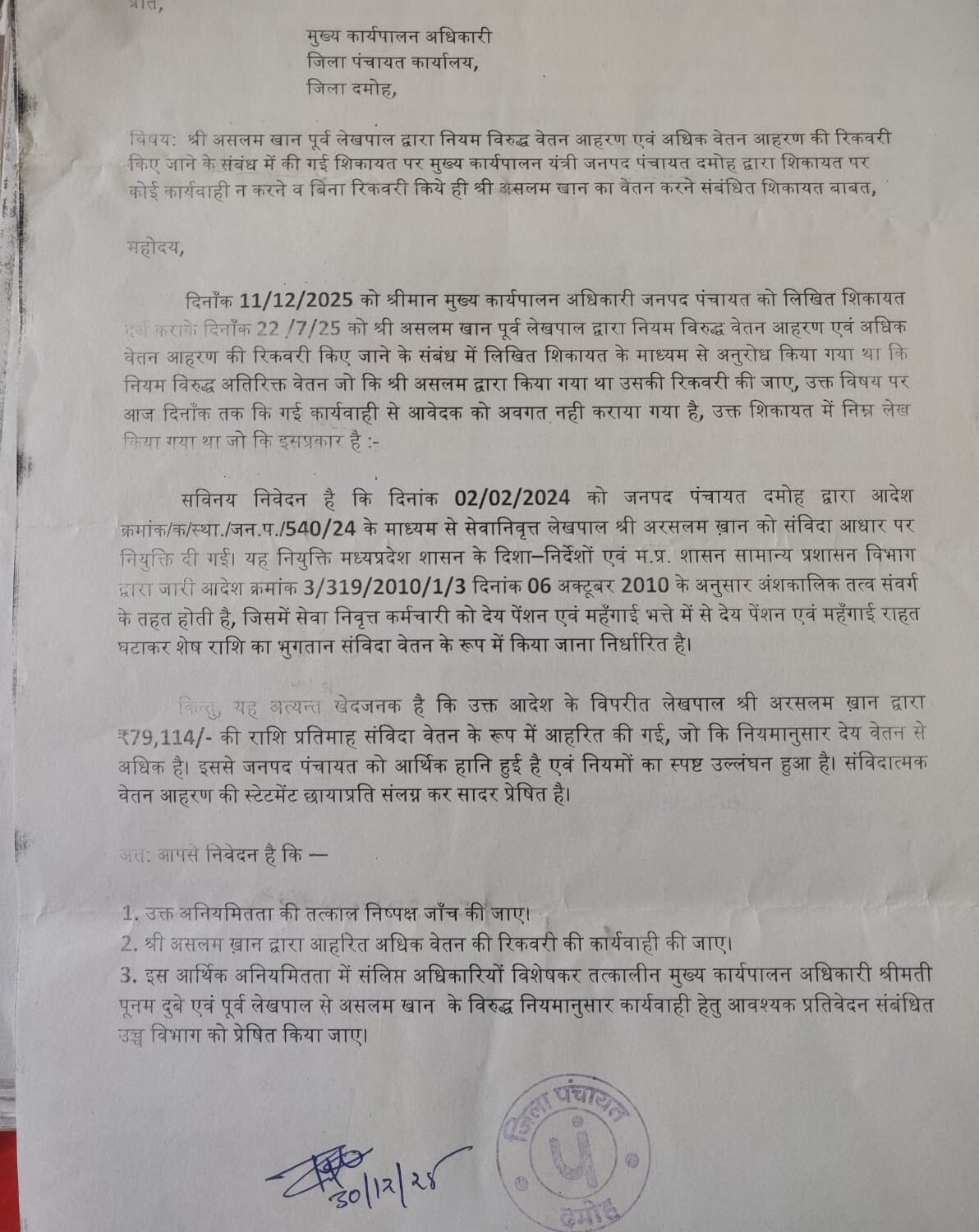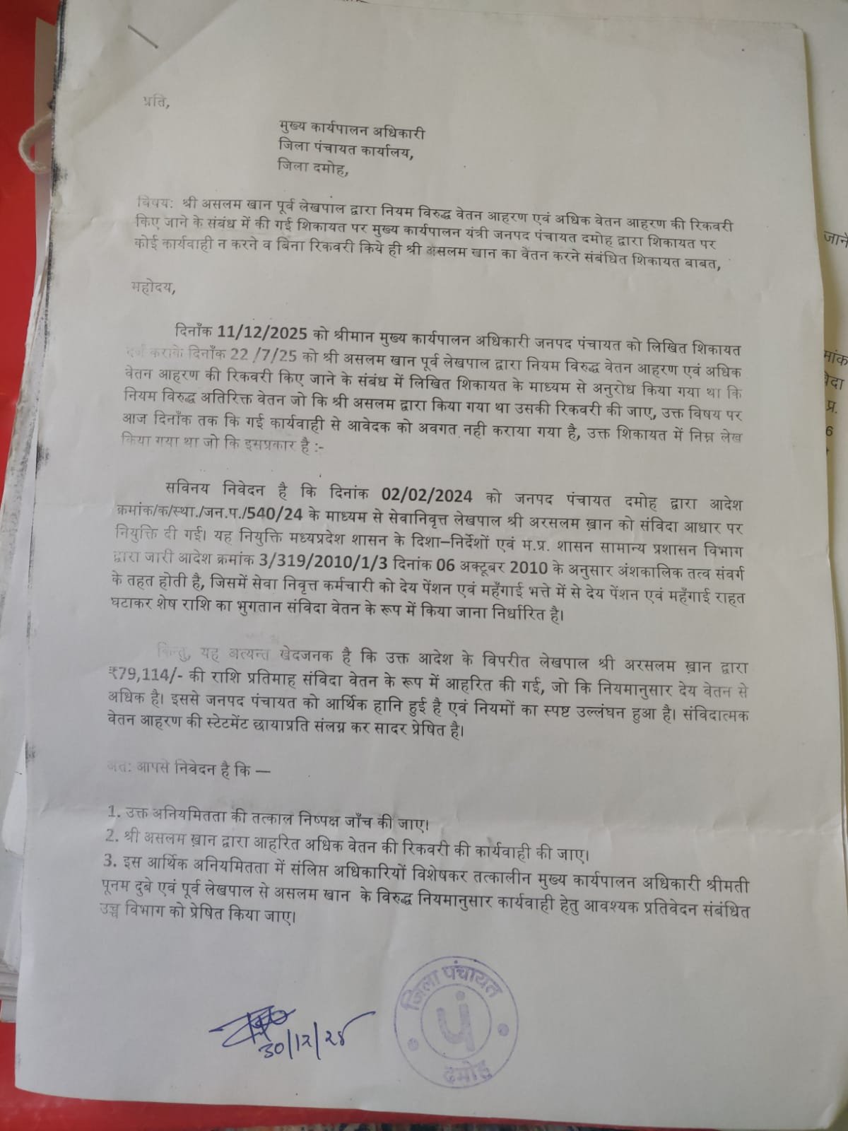 दमोह। जनपद पंचायत दमोह में पूर्व लेखपाल श्री असलम खान द्वारा नियम विरुद्ध संविदा वेतन आहरण का गंभीर मामला सामने आया है। आरोप है कि सेवानिवृत्ति के बाद संविदा नियुक्ति के दौरान शासन के स्पष्ट नियमों की अनदेखी कर प्रतिमाह ₹79,114 का भुगतान किया गया, जिससे शासकीय खजाने को आर्थिक क्षति पहुँची। हैरानी की बात यह है कि इस संबंध में कई बार लिखित शिकायतें दिए जाने के बावजूद जिला एवं जनपद पंचायत के वरिष्ठ अधिकारियों द्वारा अब तक कोई ठोस कार्रवाई नहीं की गई।